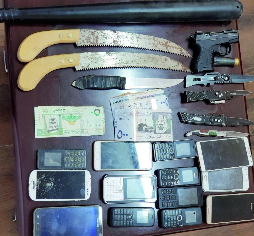 جوالات وأسلحة بيضاء ومبالغ مالية عثر عليها بحوزة اللصوص. (عكاظ)