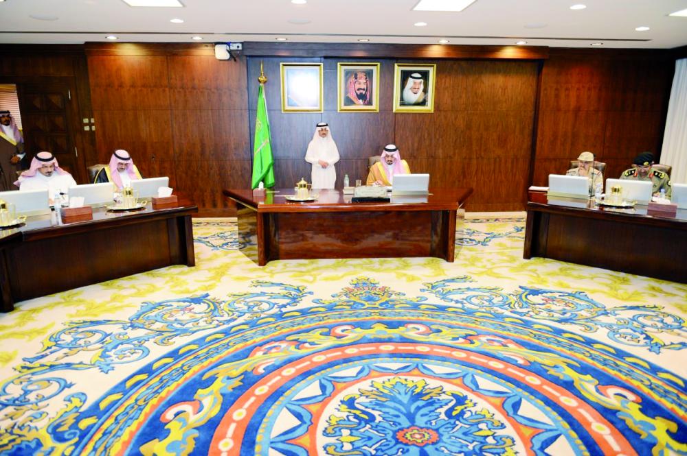 الأمير فيصل بن خالد مترئساً الاجتماع الطارئ للجنة الرئيسية للدفاع المدني بالمنطقة. (عكاظ)