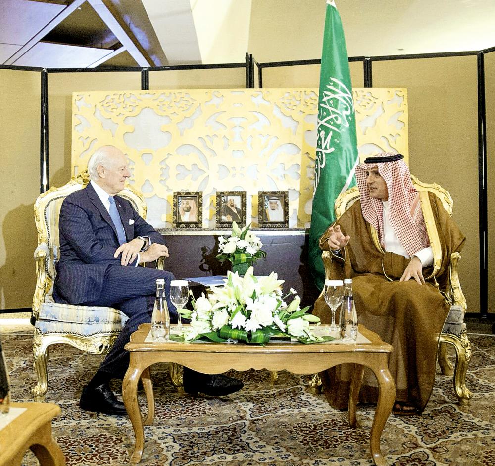 عادل الجبير مستقبلا المبعوث الأممي إلى سورية أمس في الرياض. (واس)