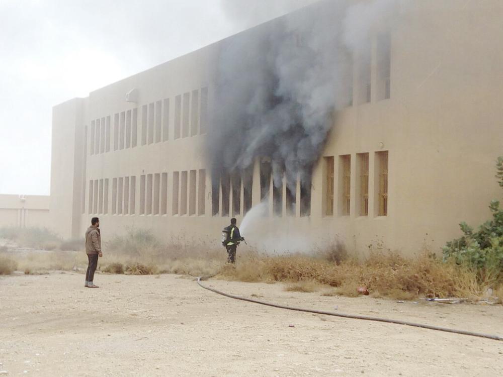 وفي السياق رصدت «عكاظ» فرق الدفاع المدني وهي تخمد الحريق في الفصل، وتمنع امتداده إلى بقية الفصول.