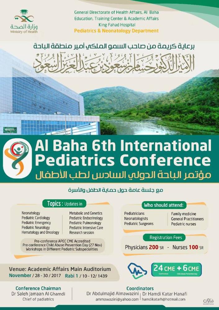 يدشن أمير منطقة الباحة الأمير الدكتور حسام بن سعود، بعد ظهر اليوم (الثلاثاء) في مستشفى الملك فهد، المؤتمر الدولي السادس لطب الأطفال، بمشاركة 500 متخصص وباحث ومتابع يناقشون أبرز مستجدات علاج أمراض الأطفال ووقايتهم وسلامة صحتهم الجسدية والنفسية على مدى ثلاثة أيام.