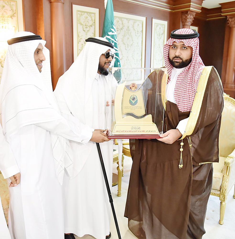 نائب أمير جازان متسلما درعا تذكارية من جمعية الثريا للمكفوفين. (عكاظ)