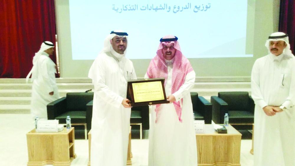 الوهيبي مكرما أحد المشاركين في الملتقى. (عكاظ)