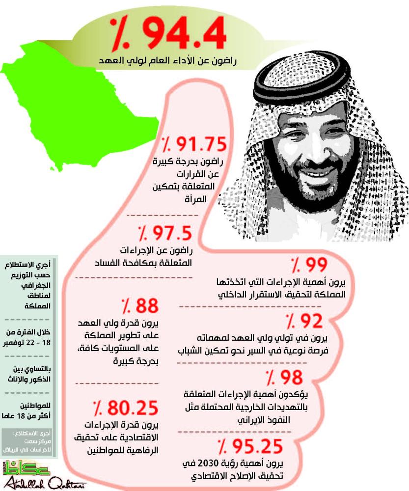 وبيَّن الاستطلاع الذي أجراه مركز سمت للدراسات في مدينة الرياض، أن 94.4% من المستطلعة آراؤهم في مختلف مناطق المملكة، راضون عن أداء ولي العهد، ويرون في ذلك أثرا من خلال حدوث تحسن «بدرجة كبيرة» في الأداء العام السياسي والاقتصادي والاجتماعي، وذلك بعد خمسة أشهر من توليه للمنصب، وهو أداء يُمكِّنه ــ وفق الاستطلاع ــ من بناء مستقبل أفضل للمملكة، على اعتباره عرَّابا لأغلب المشاريع الإصلاحية الجديدة.