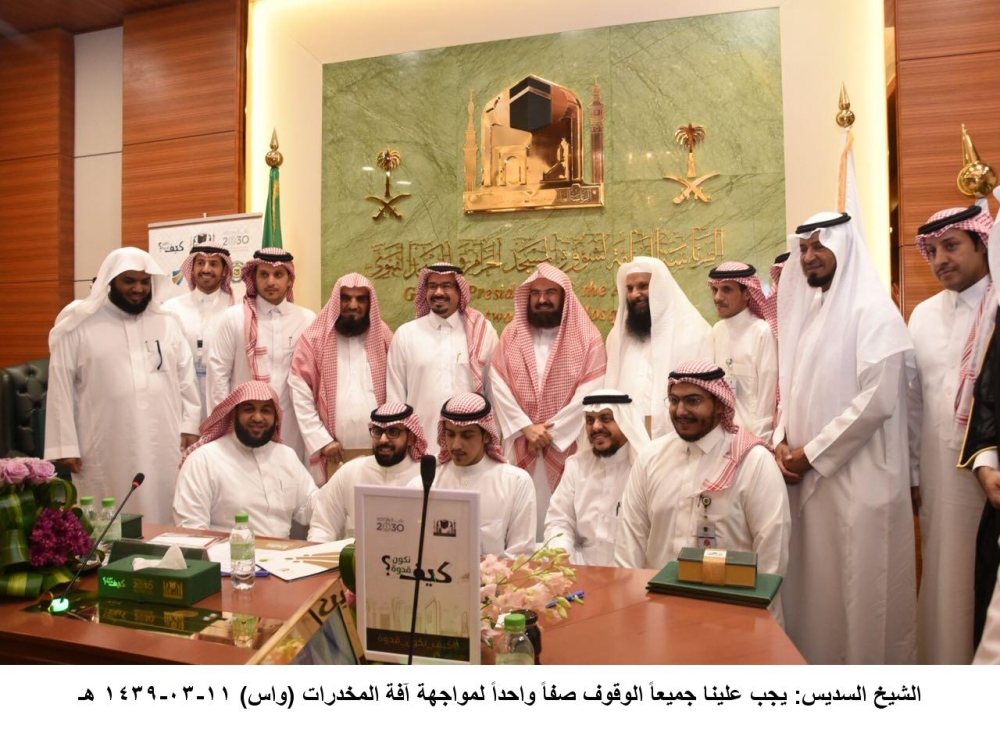 السديس مع مسؤولي اللجنة الوطنية لمكافحة المخدرات.(عكاظ)