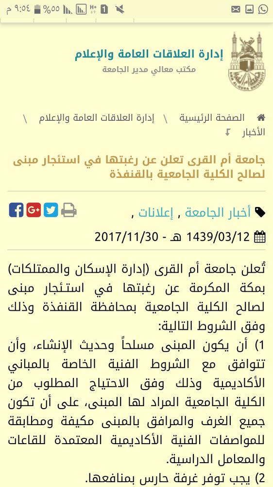 أعلنت جامعة أم القرى، ممثلة في إدارة الإسكان والممتلكات، رغبتها في استئجار مبنى لصالح الكلية الجامعية للبنات في محافظة القنفذة.