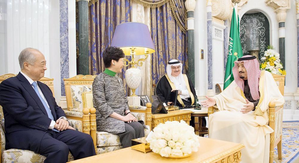 الملك سلمان مستقبلا الرئيسة التنفيذية لحكومة هونج كونج أمس في الرياض.