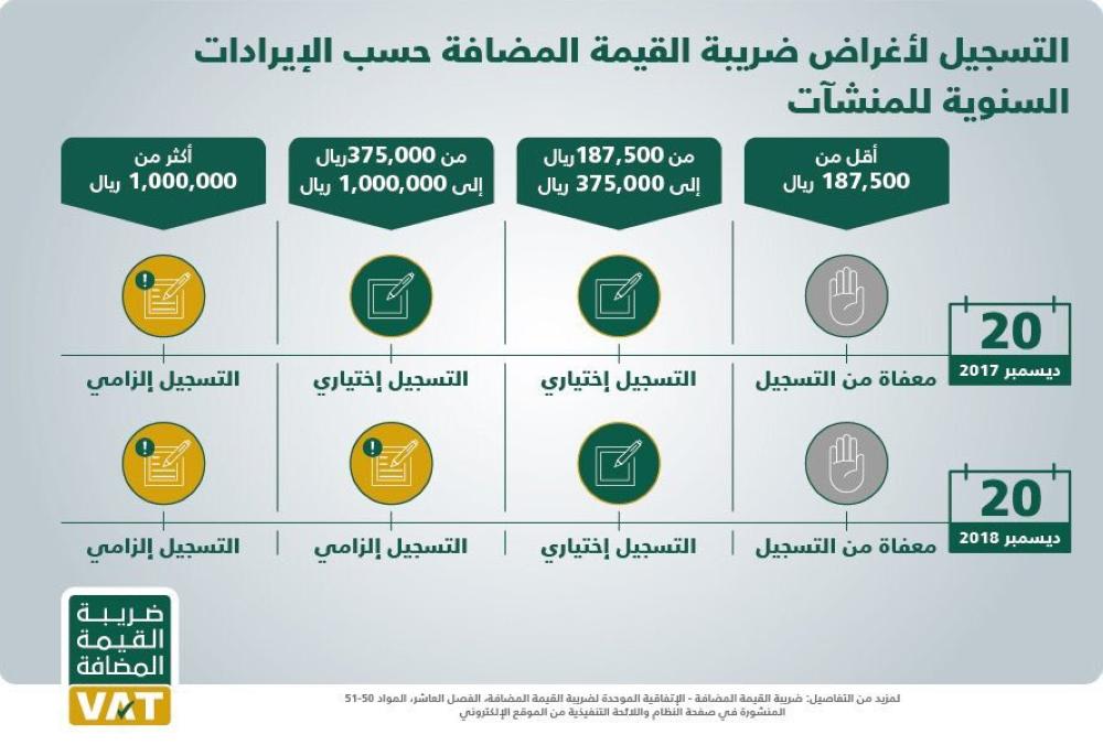 أوضحت هيئة الزكاة والدخل، أن المنشآت التي يقل إيرادها السنوي عن 187.500 معفاة من التسجيل في ضريبة القيمة المضافة.