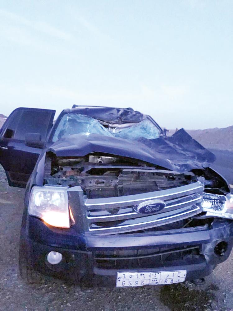 مركبة المعلمات بعد اصطدامها بالجمل السائب. (عكاظ)