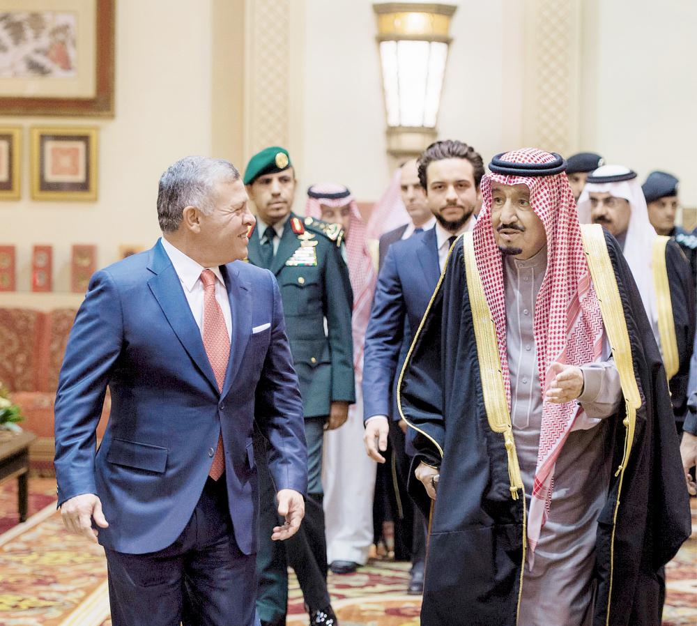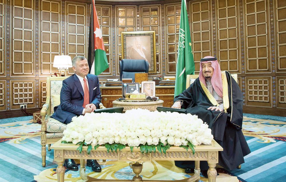 عقد خادم الحرمين الشريفين الملك سلمان بن عبدالعزيز في قصره بالرياض أمس (الثلاثاء)، جلسة محادثات رسمية مع ملك المملكة الأردنية الهاشمية الملك عبدالله الثاني ابن الحسين، تم خلالها بحث مجمل الأحداث والتطورات التي تشهدها المنطقة، خاصة التطورات المتصلة بموضوع القدس والتداعيات الخطيرة لقرار الولايات المتحدة الأمريكية بالاعتراف بالقدس عاصمة لإسرائيل ونقل سفارتها إليها، الأمر الذي سيضفي مزيداً من التعقيد على النزاع الفلسطيني الإسرائيلي، ويؤثر على أمن واستقرار المنطقة.