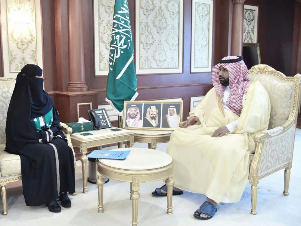 الأمير محمد بن عبدالعزيز مستقبلا رئيسة «تراحم». (عكاظ)