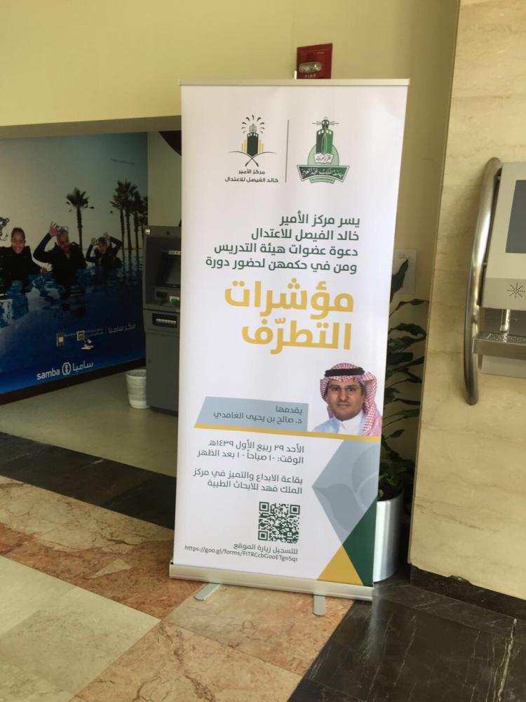 أقام مركز الأمير خالد الفيصل للاعتدال بجامعة الملك عبدالعزيز بجدة دورة خاصة لعضوات هيئة التدريس بالجامعة، عن مؤشرات التطرّف وكيفية تحصين الشباب والفتيات من تلك الآفة المهلكة للأفراد والمجتمعات.