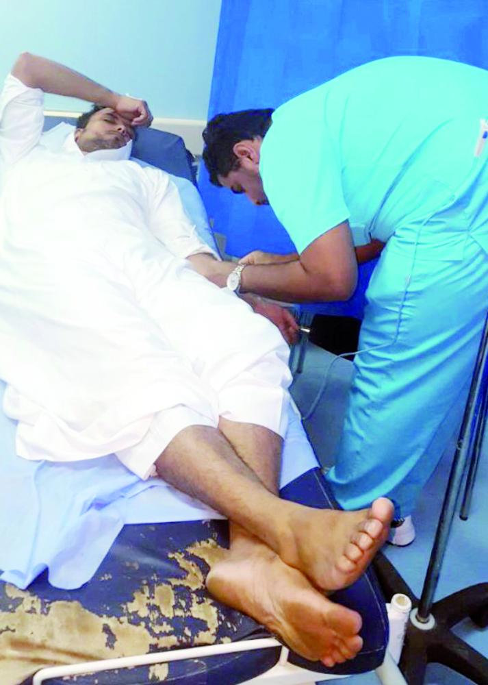 المعلم محمد خواجي يتلقى العلاج بعد تعرضه للضرب. (عكاظ)