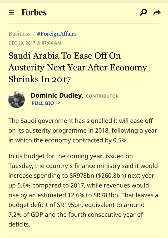 واستعرضت صحيفة «الفوربس» تقرير وزارة المالية في بيانها الصادر أول أمس (الثلاثاء)، من أنها ستزيد الإنفاق إلى 978 مليار ريال (260.8 مليار دولار) في العام القادم، بزيادة 5.6%، مقارنة بعام 2017، بينما سترتفع الإيرادات بنسبة 12.6% لتصل إلى 783 مليار ريال؛ ما يترك عجزا في الميزانية قدره 195 مليار ريال أي ما يعادل نحو 7.2% من الناتج المحلي الإجمالي.