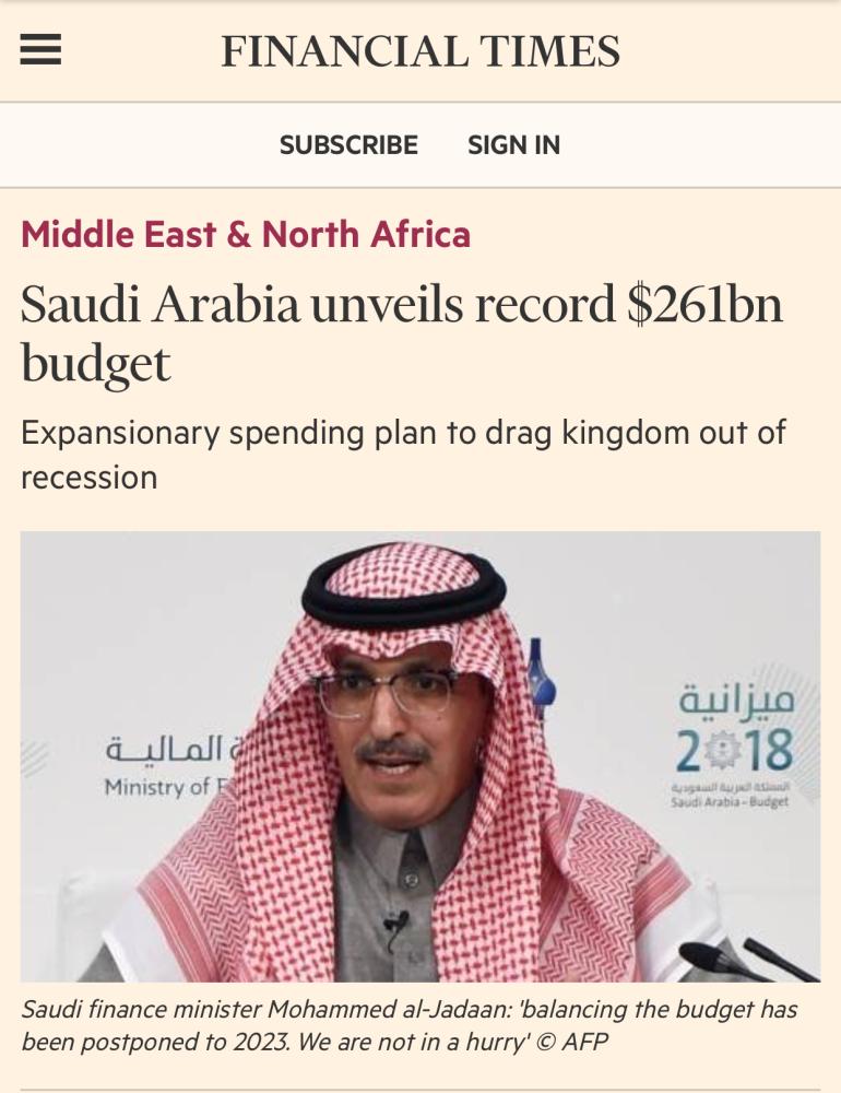 وذكرت صحيفة «فاينانشيال تايمز» البريطانية «المملكة كشفت عن ميزانية قياسية، بخطة إنفاق توسعية، تصل إلى 261 مليار دولار».