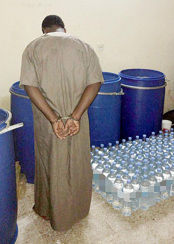 وفي الرياض أوقعت قوة المهمات والواجبات الخاصة بشرطة المنطقة بإثيوبي حول شقة سكنية في حي منفوحة لمنصع إنتاج خمور، وشملت المضبوطات 11 برميلا و120 قارورة مسكر، وتم إيقاف الإثيوبي وإتلاف المصنع.