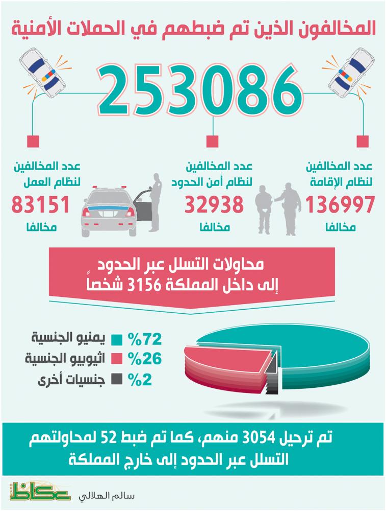 بلغ عدد المخالفين الذين تم ضبطهم في حملات وطن بلا مخالف بمختلف مناطق السعودية 253086، منهم 136997 مخالفا لنظام الإقامة، و32938 لنظام أمن الحدود، و83151 للعمل.