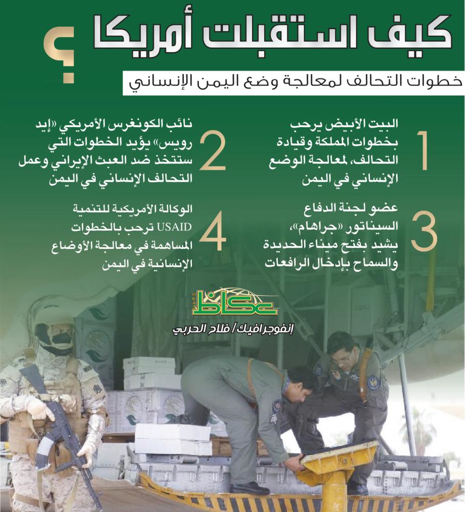 ورحب البيت الأبيض بالخطوات التي أعلنت عنها المملكة وقيادة التحالف، لمعالجة الوضع الإنساني في اليمن، وما يتعلق بفتح الموانئ، والسماح بإدخال الرافعات الأربع، وأدان بشدة ميليشيا الحوثي وإيران، لعدوانها المتهور واستهدافها المواقع المدنية في المملكة بالصواريخ الباليستية.