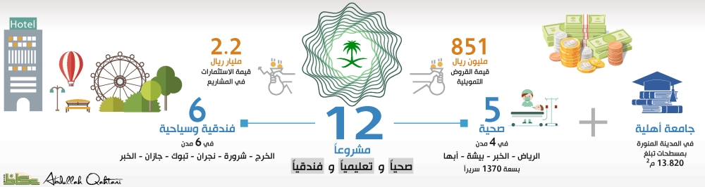 أعلنت وزارة المالية، موافقتها على تمويل 12 مشروعاً صحياً وتعليمياً وفندقياً بإجمالي قروض بلغ 851 مليون ريال، باستثمارات تبلغ قيمتها 2.2 مليار ريال، ضمن برنامج الإقراض الحكومي، في إطار تعزيز الخدمات الأساسية المقدمة للمواطنين من خلال تفعيل دور القطاع الخاص في المجالات التنموية.