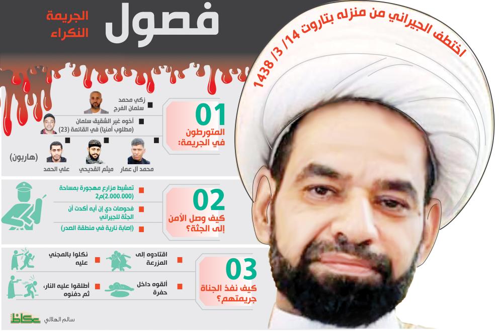 صرح المتحدث الأمني بوزارة الداخلية بأنه إلحاقاً للبيان المعلن بتاريخ 3/4/1438هـ المتضمن ما توصلت إليه التحقيقات في جريمة اختطاف الشيخ محمد بن عبدالله الجيراني قاضي دائرة الأوقاف والمواريث من أمام منزله ببلدة تاروت صباح الثلاثاء الموافق 14/3/1438هـ والمعلن عنها بتاريخ 15/3/1438هـ، والتي كشفت عن هوية عدد من المتورطين في هذه الجريمة، وامتداداً للتحقيقات المستمرة التي تجريها الجهات الأمنية في هذه القضية، فقد توافرت لديها معلومات أكدت إقدام من قاموا باختطافه على قتله وإخفاء جثته في منطقة مزارع مهجورة تسمى «الصالحية»، وتورط المواطن زكي محمد سلمان الفرج وأخيه غير الشقيق المطلوب أمنياً سلمان بن علي سلمان الفرج أحد المطلوبين على قائمة الـ23، والمعلن عنها بتاريخ 8/2/1433هـ مع تلك العناصر في هذه الجريمة البشعة.
