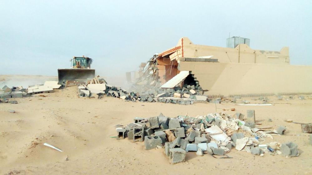 آليات لجنة مراقبة الأراضي تزيل مبنى مخالفا. (عكاظ)