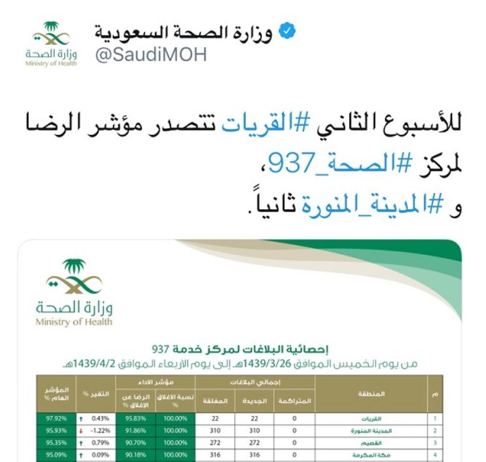 أعلنت وزارة الصحة، أمس (الاثنين) المؤشر الأسبوعي لمركز الصحة 937، الذي يوضح نسبة إغلاق البلاغات والرضا عن الإغلاق في كل منطقة.