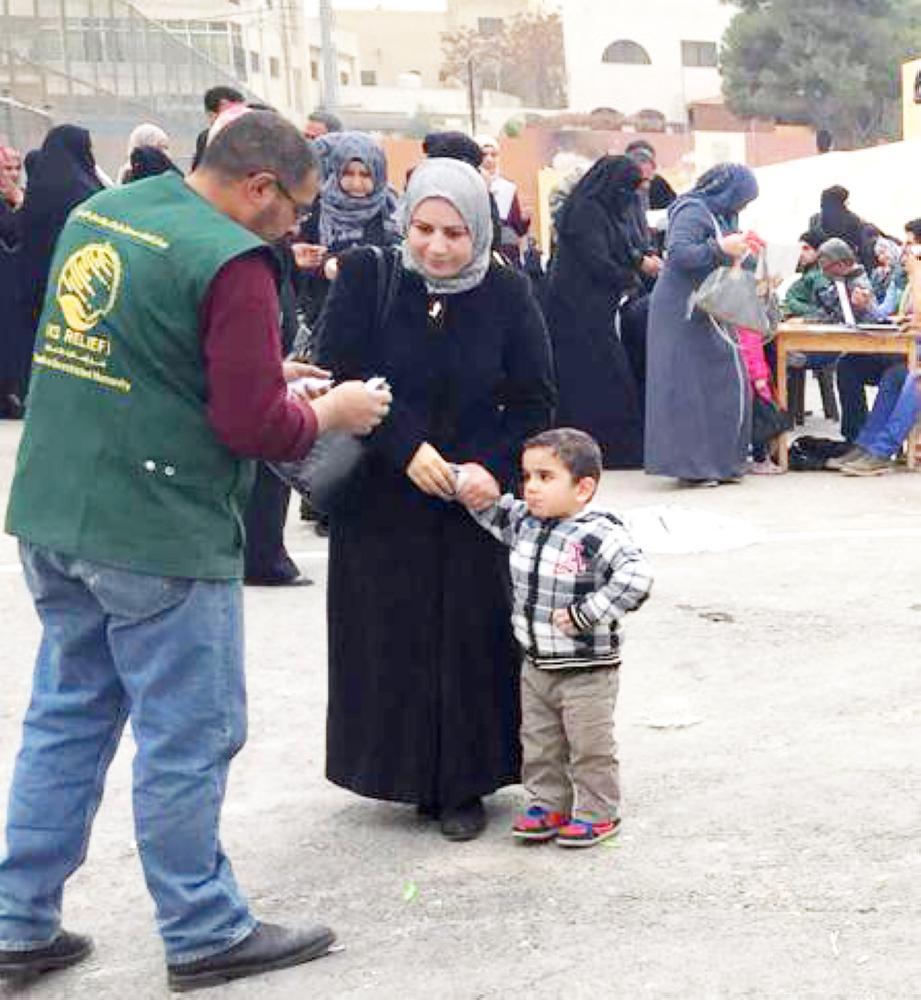 توزيع المساعدات على اللاجئين السوريين.(عكاظ)