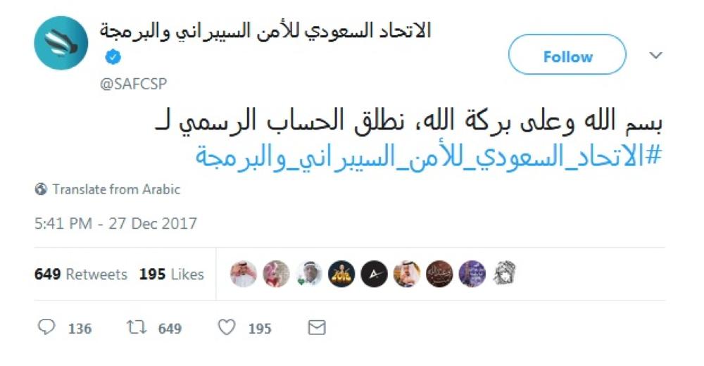 دشن الاتحاد السعودي للأمن السيبراني والبرمجة، حسابه على «توتير» (SAFCSP@) بتغريده افتتاحية «بسم الله وعلى بركة الله، نطلق الحساب الرسمي لـ #الاتحاد_السعودي_للأمن_السيبراني_والبرمجة».