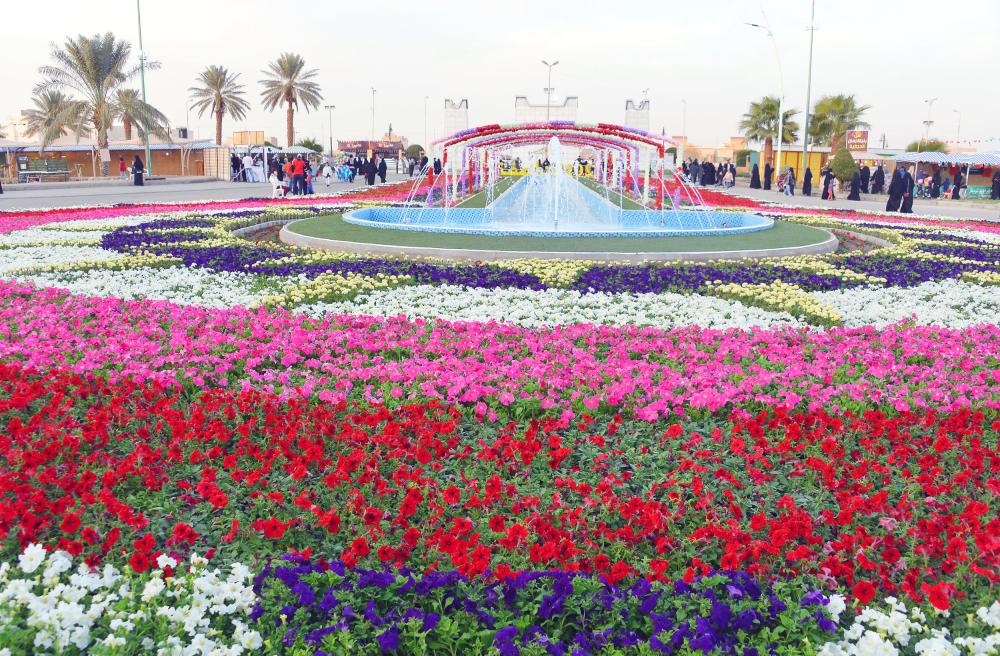زوار يستمتعون بسجادة الزهور في مهرجان نفحات البكيرية. (عكاظ)