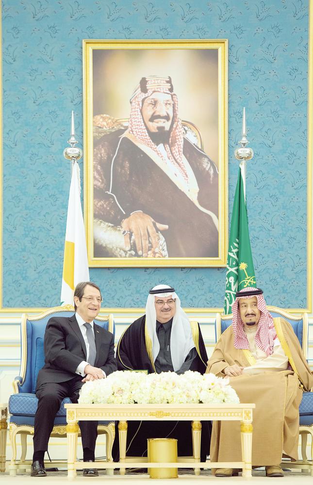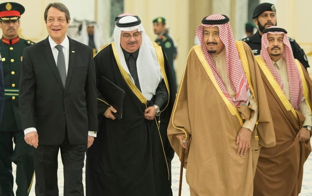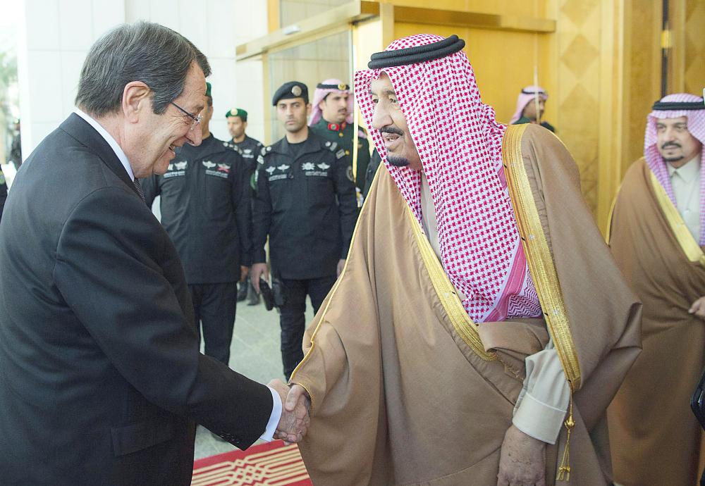 عقد خادم الحرمين الشريفين الملك سلمان بن عبدالعزيز في قصر اليمامة بالرياض أمس (الأربعاء) جلسة محادثات رسمية مع رئيس جمهورية قبرص نيكوس اناستاسيادس، جرى خلالها استعراض العلاقات الثنائية وسبل تعزيز وتنمية التعاون بين المملكة وقبرص في مختلف المجالات، وبحث مستجدات الأحداث في المنطقة التي تطابقت وجهات نظر البلدين حيالها.