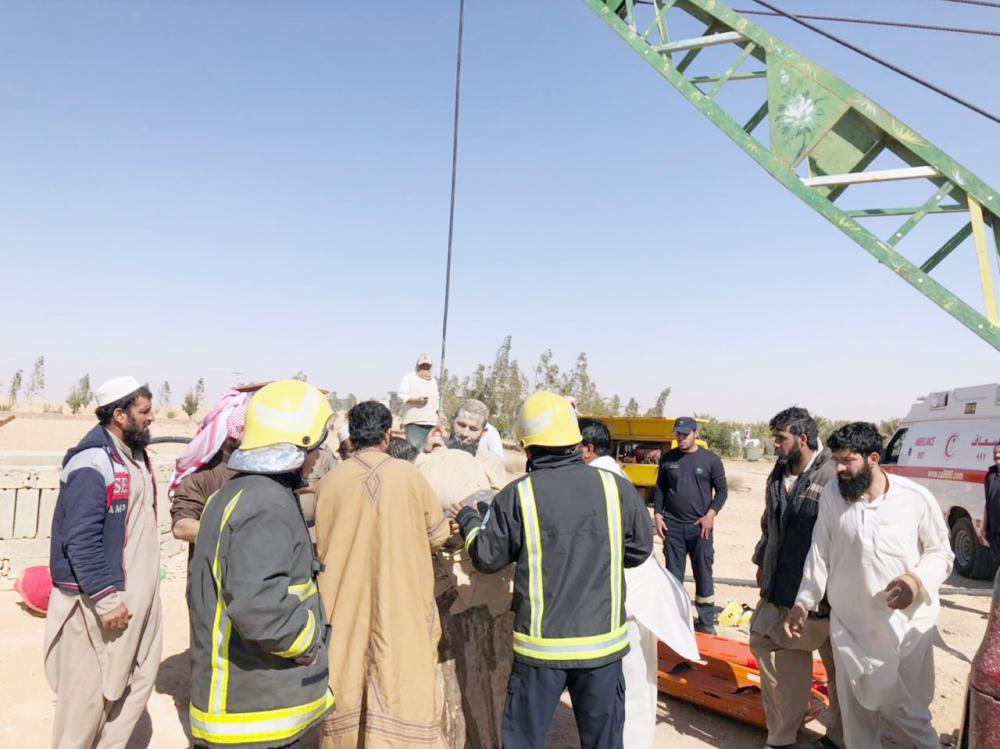 رافعة الدفاع المدني أثناء إخراج المصابين والمتوفى من البئر. (عكاظ)