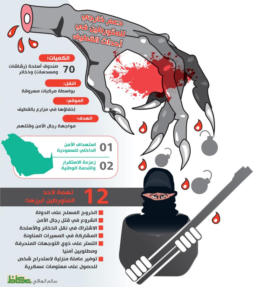 كشفت النيابة العامة أمام المحكمة الجزائية المتخصصة بالرياض أمس (الثلاثاء)، أن الإرهابيين المتورطين في أحداث محافظة القطيف، تلقوا دعما من إحدى الدول، عبارة عن 70 صندوق أسلحة (رشاشات ومسدسات) وذخائر، لاستخدامها في مواجهة رجال الأمن وقتلهم، واستهداف الأمن الداخلي للسعودية وزعزعة استقراره ولحمته الوطنية.