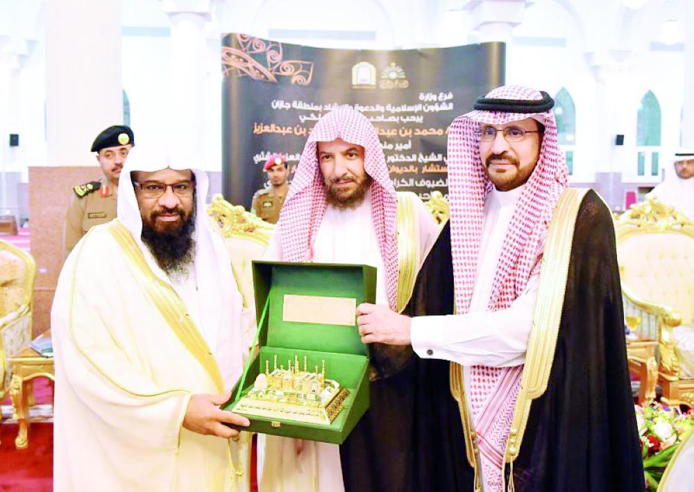 الشيخ الشثري خلال توزيع الهدايا التذكارية عقب المحاضرة التوعوية. (عكاظ)