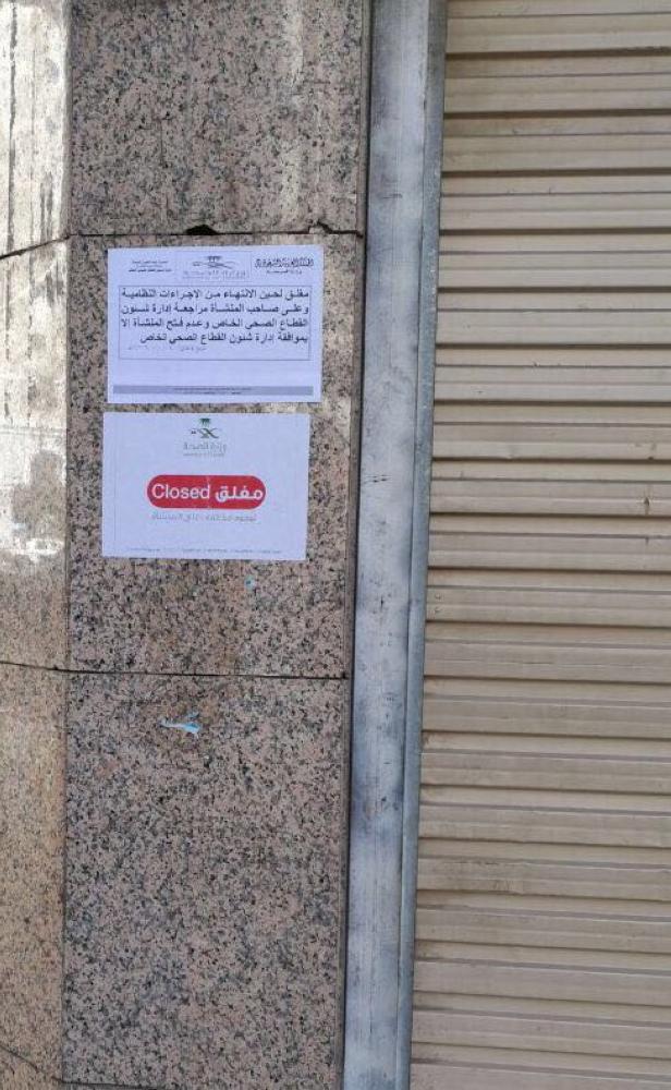 كما أغلقت صيدلية في القصيم لعدم وجود تراخيص للكوادر، و6 مجمعات طبية ومعملي أسنان وصيدليتين في الرياض لوجود عدد من المخالفات وهي كوادر تعمل دون تراخيص، عدم تعقيم الأدوات الطبية، وجود تسعيرة غير معتمدة، قصور في نظام التخلص من النفايات الطبية، انتهاء رخصة معمل الأسنان.