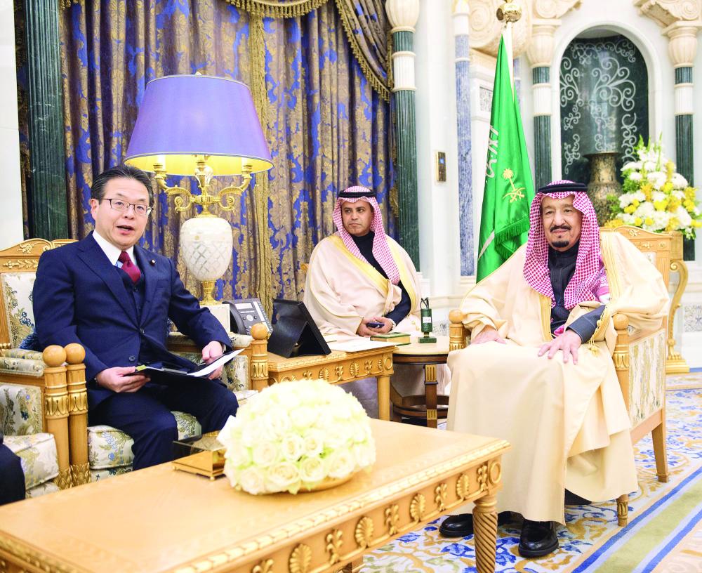 الملك سلمان مستقبلا وزير الاقتصاد والتجارة والصناعة والطاقة الياباني أمس في قصر اليمامة بالرياض. (واس)