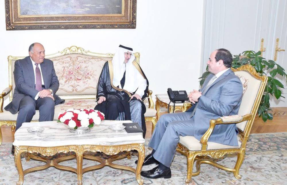 السيسي أثناء لقائه أمين عام منظمة التعاون الإسلامي د. يوسف العثيمين، بحضور وزير الخارجية المصري سامح شكري. (عكاظ)