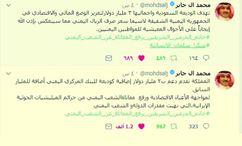 قال السفير السعودي لدى اليمن محمد سعيد آل جابر أن الوديعة التي قدمتها المملكة العربية السعودية للبنك المركزي اليمني تهدف إلى مواجهة الأعباء الاقتصادية ورفع المعاناة عن الشعب اليمني الشقيق جراء جرائم الميليشيات الحوثية الإيرانية، التي نهبت مقدرات الدولة والشعب اليمني. وقال في تغريدات على حسابه في تويتر أمس (الأربعاء) «تهدف الوديعة السعودية لتعزيز الوضع المالي والاقتصادي في الجمهورية اليمنية الشقيقة، لاسيما سعر صرف الريال اليمني مما سينعكس - بإذن الله - إيجاباً على الأحوال المعيشية للمواطنين اليمنيين».