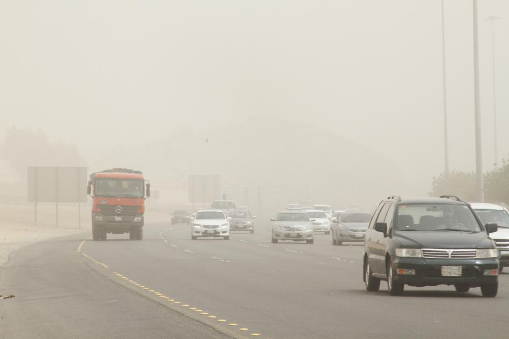 طريق جدة - مكة السريع كما بدا صباح أمس، وقد تدنت الرؤية الأفقية نتيجة الغبار. (تصوير: موسى الأحمري)