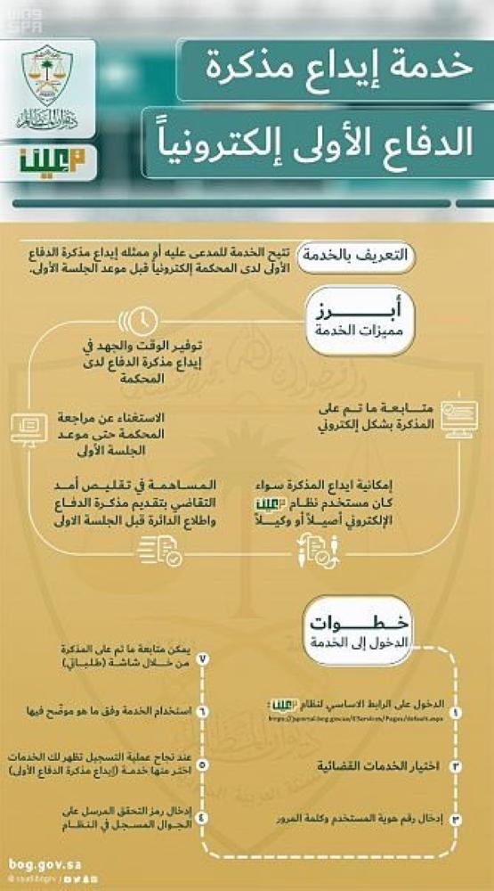 وتتيح الخدمة للمدعى عليه أو ممثله، إيداع مذكرة الدفاع الأولى إلكترونياً لدى المحكمة قبل موعد الجلسة الأولى, بحيث لا يأتي موعدها الأول إلا وقد اكتمل أمام الدائرة لائحة الدعوى المقدمة الكترونياً والرد عليها.