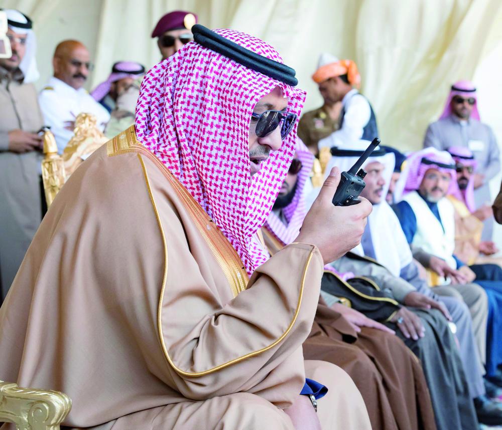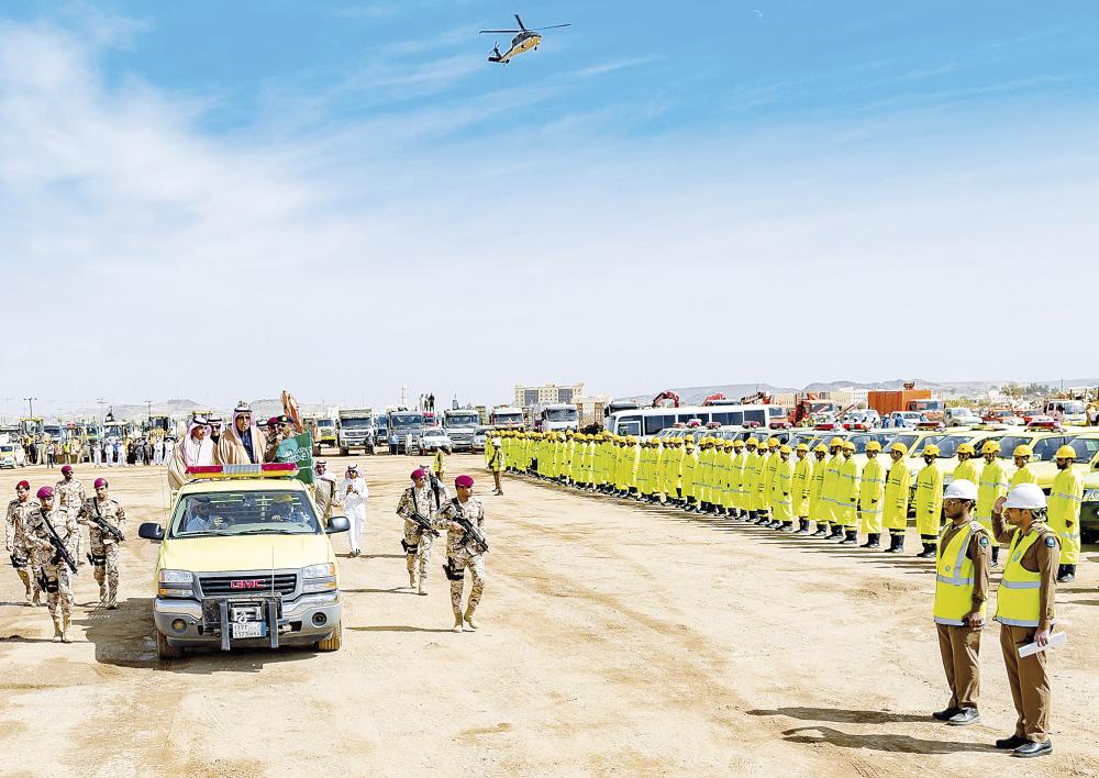 وفور وصوله لمقر تنفيذ الفرضية، استقل عربة مكشوفة وتجول بميدان الفرضية الذي احتوى على أكثر من 450 مركبة من الآليات والمعدات الفنية والثقيلة، ويضم أكثر من 1000 فرد، واستمع إلى شرح من مدير الدفاع المدني بمنطقة الباحة العميد علي بن خضران المنتشري عن الفرضية وآلية تنفيذها والهدف منها.