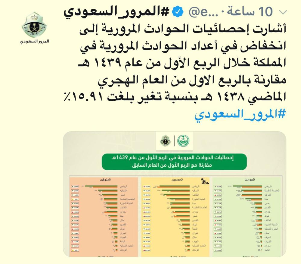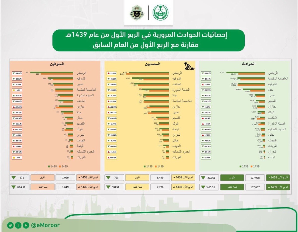 أكدت إحصائية أصدرتها إدارة المرور أمس الأول (الخميس) عن حوادث الربع الأول من العام الحالي 1439 مقارنة بالربع الأول من العام الماضي 1438 أن منطقة جازان الأعلى في نسبة وفيات الحوادث بنسبة 19.85٪، تليها تبوك بنسبة 17.39٪، ثم الباحة بنسبة 6.67٪، فيما انخفضت نسبة الحوادث بجازان بنسبة 6.07٪ مقارنة بالربع الأول من العام الماضي.