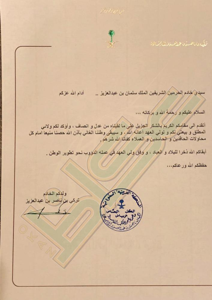 تركي بن ناصر لخادم الحرمين: أشكركم على العدل والإنصاف.. وفق الله ولي العهد في عمله الدؤوب