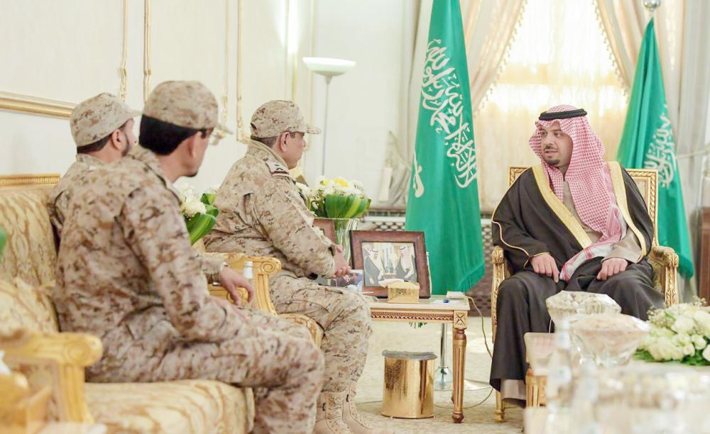 الأمير فيصل بن خالد خلال استقبال قائد المنطقة الشمالية. (عكاظ)