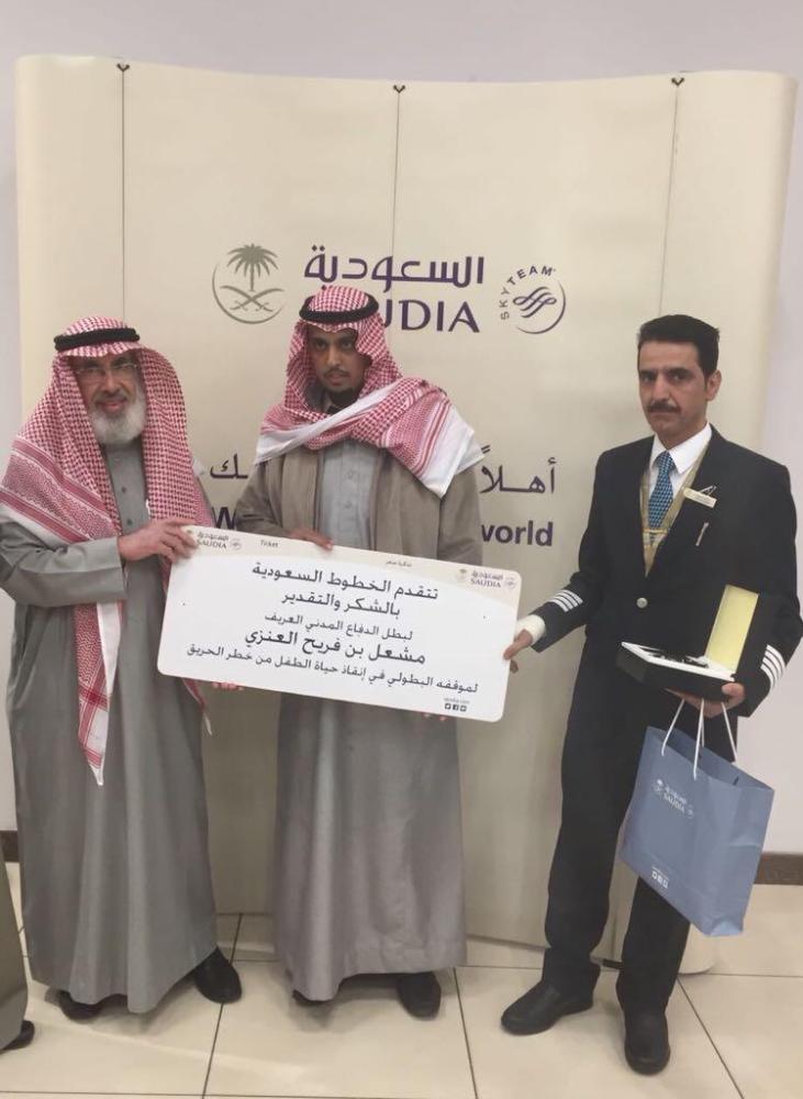 كرمت الخطوط الجوية العربية السعودية، رجل الدفاع المدني بحائل مشعل بن فريح العنزي؛ نظير موقفه البطولي الذي سطره لإنقاذه سيدة من حريق وقع أخيرا في إحدى العمائر السكنية بحي صديان الغربي بمدينة حائل.