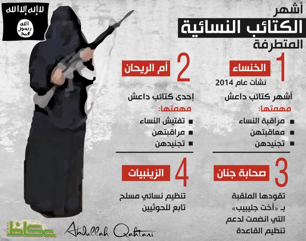 حذر مركز «اعتدال» العالمي لمكافحة الفكر المتطرف، من 4 كتائب نسائية متطرفة روعت الآمنين ومارست القتل، وهي؛ «الخنساء» نشأت عام 2014 وتُعد أشهر كتائب التنظيم الإرهابي «داعش» متطرفة بأدوار مختلفة أبرزها مراقبة النساء ومعاقبتهن وتجنيدهن، ومثلها «أم الريحان» وهي كذلك إحدى كتائب «داعش» النسائية ومهمتها تفتيش النساء ومراقبتهن وتجنيدهن، والثالثة «صحابة جنان» وتقودها الملقبة بـ«أخت جليبيب» انضمت لدعم تنظيم القاعدة، والكتيبة الرابعة «الزينبيات» وهي تنظيم نسائي مسلح تابع للحوثيين.وفند المركز 7 أسباب دفعت النساء للسفر إلى أرض الهلاك، تم تلخيصها من قصص متطابقة روتها ناجيات في ما بعد، أو متورطات يبحثن عن الخلاص وهي؛ البحث عن قيمة، الهشاشة الفكرية والعاطفية، وجود صلة قرابة بين المرأة ومن يحمل الفكر المتطرف، الأزمات النفسية، الاعتقاد بنصرة الدين، البحث المال، البحث عن عالم طوباوي.