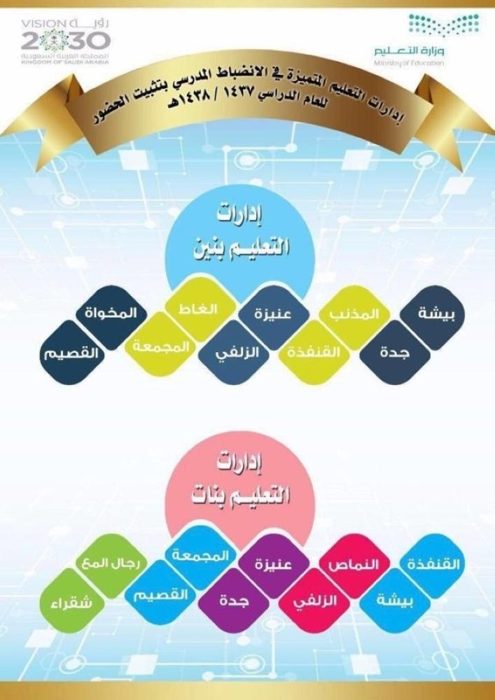 ‏و أعلن وكيل وزارة التعليم للتعليم «بنين» الدكتور نياف الجابري، من خلال حسابه الخاص على «تويتر»، ترتيب إدارات التعليم في تحقيق الانضباط، لافتاً الى أنه ستكرم 10 إدارات تعليمية للبنين ومثلها للبنات في حفل جائزة التعليم للتميز، يوم الخميس القادم، لتحقيقها الانضباط المدرسي وتميزها في تثبيت الغياب خلال الفترات المستهدفة في العام الدراسي الماضي 1437 / 1438هـ، مقدماً الشكر والتقدير للجهود التي تبذلها إدارات التعليم.