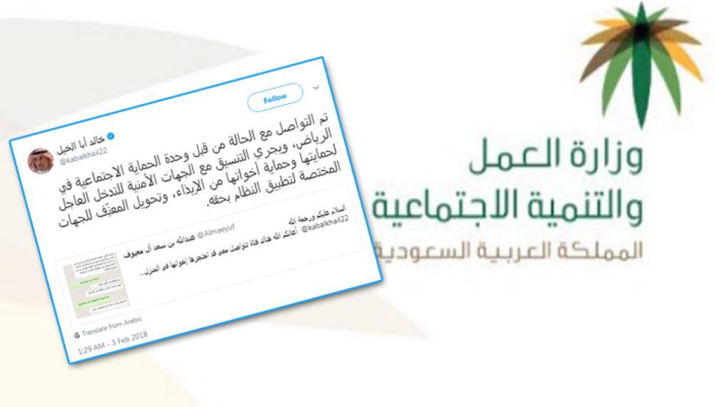 وقال المتحدث باسم وزارة العمل والتنمية الاجتماعية خالد أبا الخيل في حسابه على «تويتر» اليوم (السبت): «تم التواصل مع الحالة من قبل وحدة الحماية الاجتماعية في الرياض، ويجري التنسيق مع الجهات الأمنية للتدخل العاجل لحمايتها وحماية أخواتها من الإيذاء، وتحويل المعنِّف للجهات المختصة لتطبيق النظام بحقه»