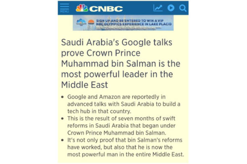 وقبل يومين تقريباً، وصفت قناة CNBC الأمريكية الأمير محمد بن سلمان بالرجل الأكثر قوة في منطقة الشرق الأوسط، وهي شهادة مستحقة من قناة واسعة الجمهور، وذلك عقب مفاوضات المملكة المتقدمة مع شركتي غوغل وأمازون، من أجل بناء واد للتقنية «سيليكون ڤالي» بالمملكة، وذلك على لسان أحد كبار كتابها وهو جاك نوفاك، موضحاً أن تلك التطورات تأتي في سياق الجهود الإصلاحية السعودية ورؤية المملكة 2030.