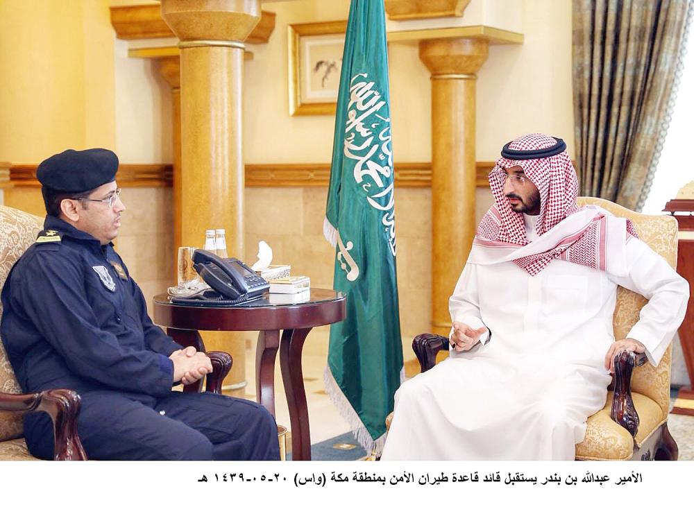 استقبل نائب أمير منطقة مكة المكرمة الأميرعبدالله بن بندر بن عبدالعزيز، أمس (الثلاثاء) في مقر الإمارة بجدة، قائد قاعدة طيران الأمن بالمنطقة العقيد محمد الثبيتي، واستمع خلال اللقاء إلى نبذة عن الأعمال التي ينفذها طيران الأمن في المنطقة، إلى جانب الخطط التي يتم تنفيذها خلال موسمي الحج والعمرة.