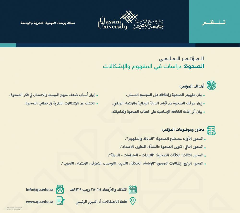 وأعلنت جامعة القصيم أمس الأول (الأحد) أنها تنوي إقامة مؤتمر علمي اعتبارا من اليوم الثلاثاء وينتهي غدا الأربعاء، قالت إنه يهدف إلى الكشف عن الإشكالات الفكرية في خطاب الصحوة، والبحث في أسباب ضعف منهج التوسط والاعتدال لدى هذا الفكر.